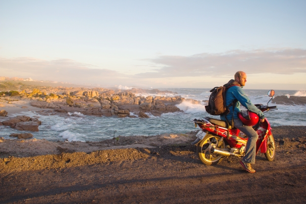 The first six months in Africa were the toughest as he headed through some unimaginably rough terrain, namely the Sahara desert. By the time he made it to Bamako, Mali, en route to the ancient city of Timbuktu, he was held up by advancing rebels and looming French air strikes and began to feel worn down. On a whim, he decided to buy a fire-engine red scooter and take the long way down on an impromptu road trip.